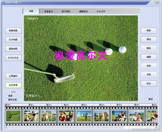 打开图片文件夹就能生成录像的电子相册软件,操作十分简单,自动配上动画,也可以添加自己的动画,做出自己满意的作品。 只需要你简单地打开照片所在的文件夹就能以动画的形式欣赏你的照片了。 如果你兴趣,可以加上自己的喜欢的背景、相框、文字、动画等。 你还可以加上自己喜欢的mp3作为背景音乐,如果有歌词文件的话,则可以当成MTV来欣赏。 既可以在自己的电脑上观看,也可以生成录像刻成光盘在电视上播放,还可以生成可执行文件发给朋友欣赏。 不要让那些记录逝去日子的珍贵照片继续在电脑中沉睡了,对于那些曾经让你喜悦、感动、伤感的人和事,您可以充分发挥自己的创造力,通过《百姓电子相册 》自带的多种特效及自定义功能,将静态的照片制作出搞笑的、温馨的、古典的、酷炫的视频,放在自己的博客上,发在经常灌水的论坛里,刻录成DVD,上传到视频网站或者是下载到手机,如同翻阅真正的相册一样跟家人和朋友分享照片和回忆。