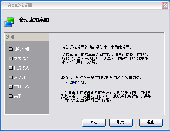 你可能看电影、写日记、QQ聊天、看股票但不希望被别人看到?当老板过来时来不及关闭这些窗口?奇幻虚拟桌面可以帮助你瞬间隐藏你不需要的窗口,而这些窗口仍然在后台正常运行,当你需要时还可以瞬间切换回来。