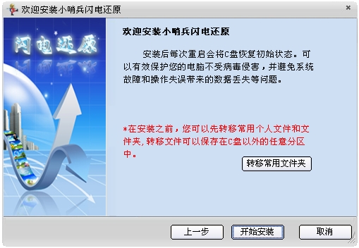 “小哨兵闪电还原”简单高效,是一款系统保护软件,性能稳定可靠。安装简单,只需几步就可以完成。使用时仅需要重启就将C盘上文件恢复到初始状态。即使不懂电脑的你只要会安装软件和重启电脑就可完成对电脑的安全维护工作了。