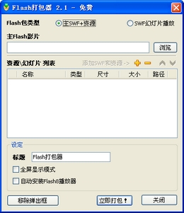 Flash打包器:如果您有一个需要载入很多文件(SWF,图片,声音等)的Flash文件(SWF),如果您有很多的Flash并希望他们能够顺序播放。Flash 打包器可以帮助您将这些文件打包成为一个单一的EXE Flash播放器方便您的传输。您可以用它将一些SWF实现的相册和他所需要的照片放在一个EXE文件中;您也可以精选一些SWF影片生成一个按您预订的顺序播放的EXE文件发送给您的朋友。