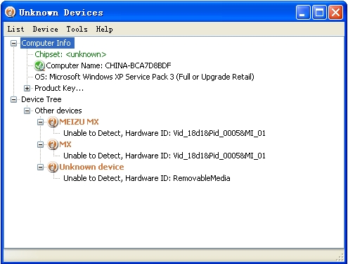 Unknown Devices会自动扫描系统上的硬件,也会自动判断这些硬件是否正确安装了驱动程序。最后还会在界面上提示你设备管理器中未知设备的型号。