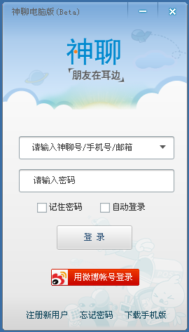 继神聊iPhone版、iPad版、神聊Android版、Symbian版之后,神聊现正式发布神聊电脑版(Windows版),独家把手机上已经深入人心的"按住对讲"功能经过精心设计,移植到电脑上,为用户在电脑上使用语音对讲功能带来方便。电脑用户也可以像手机用户一样,使用方便的对讲功能,而且支持电脑和手机互通:电脑用户可以发给手机用户,手机用户也可以发给电脑用户。神聊电脑版的主要功能由六个模块组成。分别是好友,群组,最近联系,找好友,好友管家,及设置模块。支持新浪微博账号直接登录 。