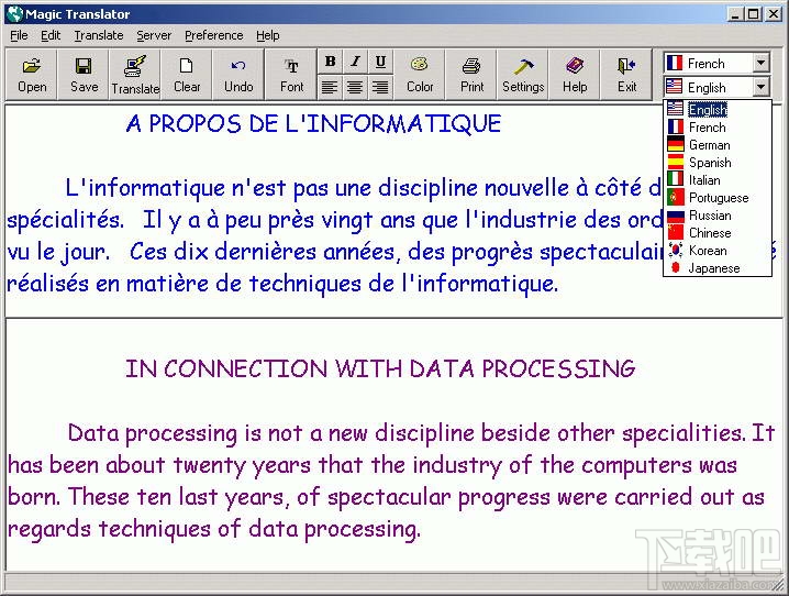 Magic Translator(魔术翻译家)是一个能在10国语言间进行自由翻译的共享软件。她利用Internet上的公共(Public Domain)或免费(Free)翻译资源,实现了10国语言任意两种之间的翻译(只有俄语结点的入度为0)。