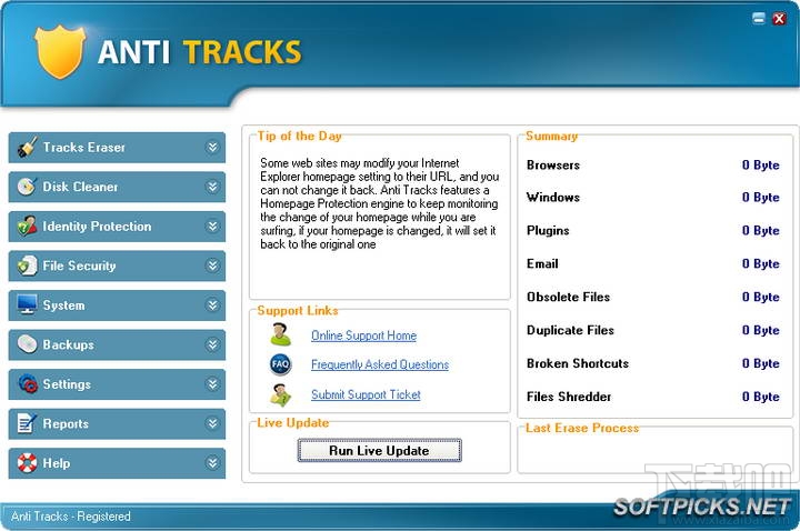 可以清除所有的历史记录:浏览器历史记录,Internet临时文件,清除缓存,cookie,剪贴板内容,以及最近文件使用记录,支持Internet Explorer, Mozilla, Firefox, Opera,并提供两种选择:在程序开始时进行清除,或者是退出程序时清除。