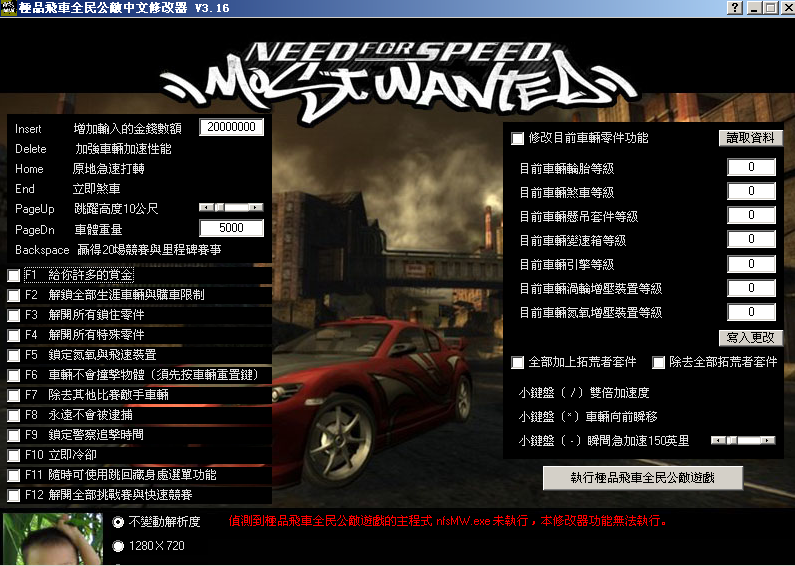 551 KB/2020-08-17极品飞车9修改器使用方法:1、下载附件的NfsMwTrainerV16.rar档案。2、解压缩到任何目录,先执行游戏,再执行本修改器。3、游戏中按下:ALT+1是锁定与输入金钱,你可以自行填入你要的数值,再按一次解除锁定