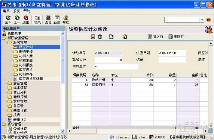 本软件一款通用性极强员工餐厅食堂管理系统,软件囊括了食材的购进、加工、前台点菜收银等全过程。软件适用于工厂,学校以及餐饮个体经营者。主要功能有:厨房管理:供应计划,采购申请,材料入库出库,盘点报废等;前台管理:票卡销售,点菜下单,酒菜上台,餐桌状态,结帐收款等;成本核算:员工薪资,固定资产,费用核算等;营业分析,能源控制,客户管理等。系统管理包括公司设置,用户管理,数据字典,数据引入引出,编码管理,办公流程设计,短信服务,邮件群发,网络控制等。本系统还提供有多种智能查询系统和报表系统,excel智能插件,让你随心所欲查找和输出数据,便于分析和管理。 本软件既适用于单机用户,也适用于网络多用户。