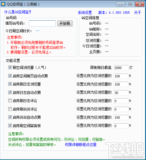 QQ空间宝,是一个强大的QQ空间刷人气软件,它利用了挂机互刷的原理刷空间浏览量、日志浏览量,自动点说说赞 、日志赞 等免费提升工具,是QQ空间达人的必备工具,想快速提高自己空间就可以下载这个QQ空间宝公测版来使用。 qq空间宝功能说明:免费刷空间浏览量 免费刷日志浏览量 免费空间首页自动点赞 免费日志自动点赞 免费说说自动点赞