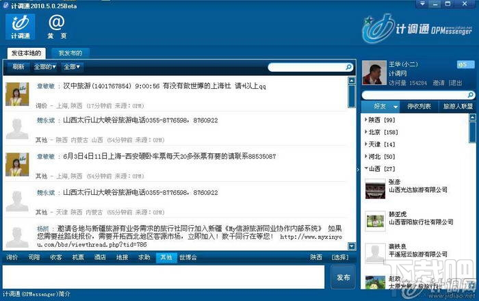 为同业产品推广不力发愁为火车票转让不出去而郁闷为DM广告成本居高不下而烦恼为找不到合适的地接社而痛苦......计调通是旅游同业信息交换平台。挂计调通能帮我们收听新的旅行社、酒店、机票代理商的同行消息。也可以对某个地区的同行发布你的产品广告,促销信息,特价信息。