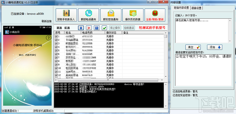9.78 MB/2020-08-17群拨号码、群发短信、自由录音、自动播放,操作简单,一看就会。用于宣传产品,或公司通知。(短信及通话产生费用由手机卡上支付。)使用方便手机与电脑连接后,可以方便的在