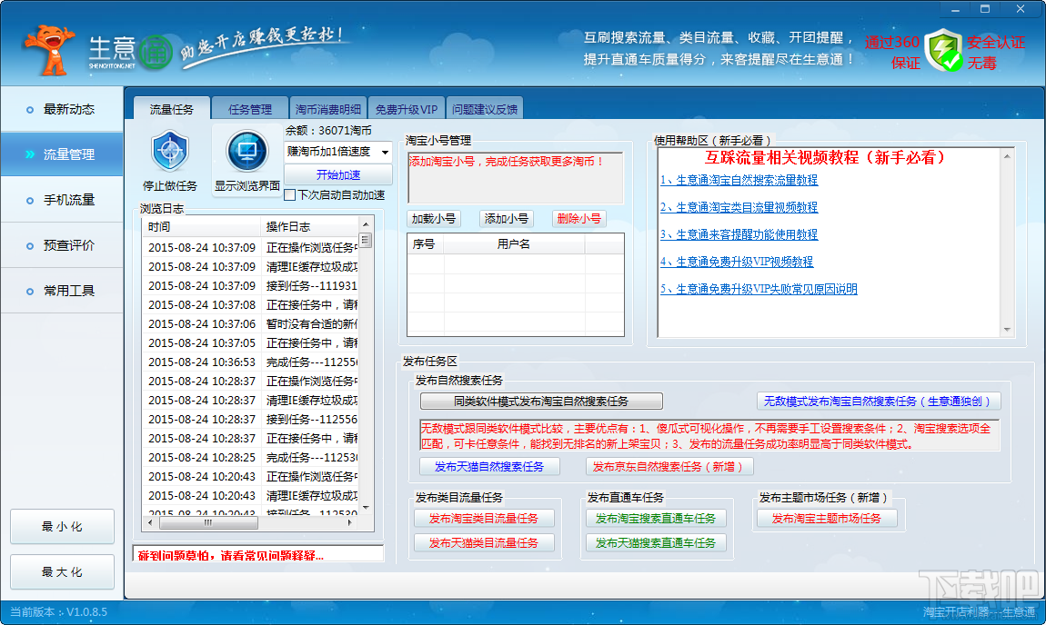 生意通淘宝流量软件主要是针对淘宝卖家开发的流量工具。完全模拟真实操作搜索关键词浏览,软件集合了淘宝卖家所有流量渠道功能应用,包括淘宝天猫APP流量、淘宝天猫自然搜索流量、淘宝天猫宝贝店铺收藏、淘宝天猫类目流量、淘宝天猫直通车搜索流量、京东各渠道流量等。独家真实收藏、预查评价。让你先人一步!