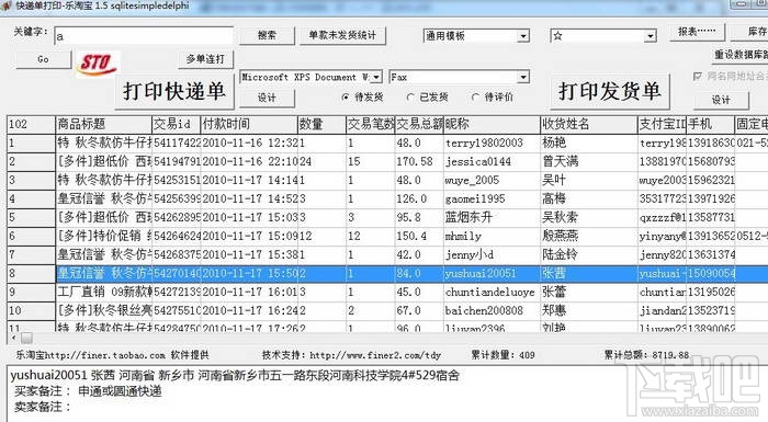 可打印快递单,发货单。连打,单打。对客户或者卖家备注的不同快递公司给予醒目提示。可提示同名不同id。同id不同地址。快递单重复打印提示。地址相同id相同买家自动合并打印。
