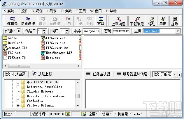 QuickFTP2000,队列监视器,仿照CuteFTP,在多个文件的下载过程中实时进行监视及修改对不同分辨率的支持(800*600,640*480,1024*768,1024*600)对不同高级COM接口的支持,让您在使用上更加省心。快捷界面的功能,彻底解决手工配置界面的复杂性集成了QUICKFTP Server,使Internet独立用户能够做到网间的高效益用户文件交。中文化的使用界面,就算不懂FTP也能操作自如。针对个人主页上传,维护完全一体化的操作界面(网虫必备)。完整的命令输入控制功能,能完全接合FTP各种高低层命令语句。结合资源管理器上载或下载文件,对NT Server下某些特殊任务的支持,对代理服务器的支持也做了比较大的改进工作,目前可以在代理服务器上使用断点续传了,如果你喜欢出国,它会很有用的。