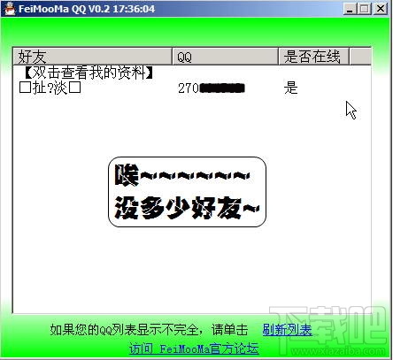 FeiMooMa QQ,基于3GQQ内核,非网页调用,超小内存占用。可实现:登录,交流(可向对方发送表情),查看我的资料,修改我的资料 等 0.2更新: 可接收对方发送的图片地址,可显示未在线好友,其它 等