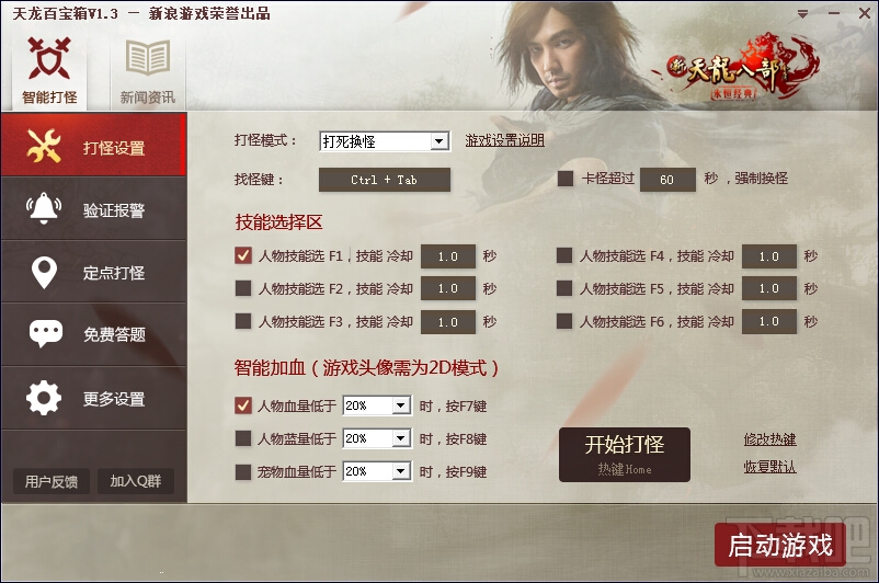 回答A:打开天龙百宝箱,在左侧有3个标签,可以根据自己的需要进行新天龙八部打怪模式的选择和辅助技能的勾选,之后点击右下角的“启动游戏”进入游戏后,按开始新天龙打怪即可。