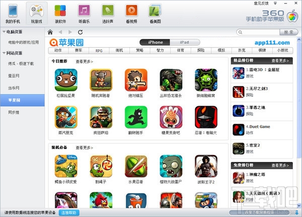 360手机助手苹果版是一款最安全、较好用的苹果设备管理软件, 支持未越狱手机,多设备同时使用,轻松切换,多种连接方式,畅享WiFi无线连接。方便用户管理iPhone、ipad、iPod touch上的应用、游戏、音乐、视频、铃声等,一键同步手机、电脑资源。海量手机资源任您淘,支持资源离线下载,批量操作,方便快捷,省时高效,下载吧提供苹果手机管理软件 iPhone/iPad下载游戏铃声软件360手机助手新版,快来尝试下把: