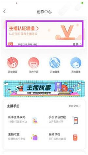 3、进入进入创作中心后,页面里有一个主播认证通道,进入通道。