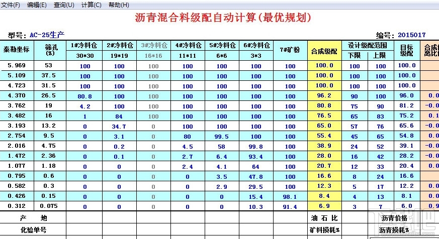 特别当矿料筛分结果不理想情况下,这种偏差更加明显,严重影响质量,本软件精确计算出“矿料配合比”下对应筛孔的重量比“筛孔配合比”,
