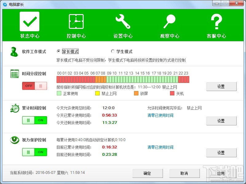 软件提供了家长模式和学生模式,方便家长和学生之间来回切换。当家长输入软件管理密码登陆后,软件自动切换为家长模式工作状态。