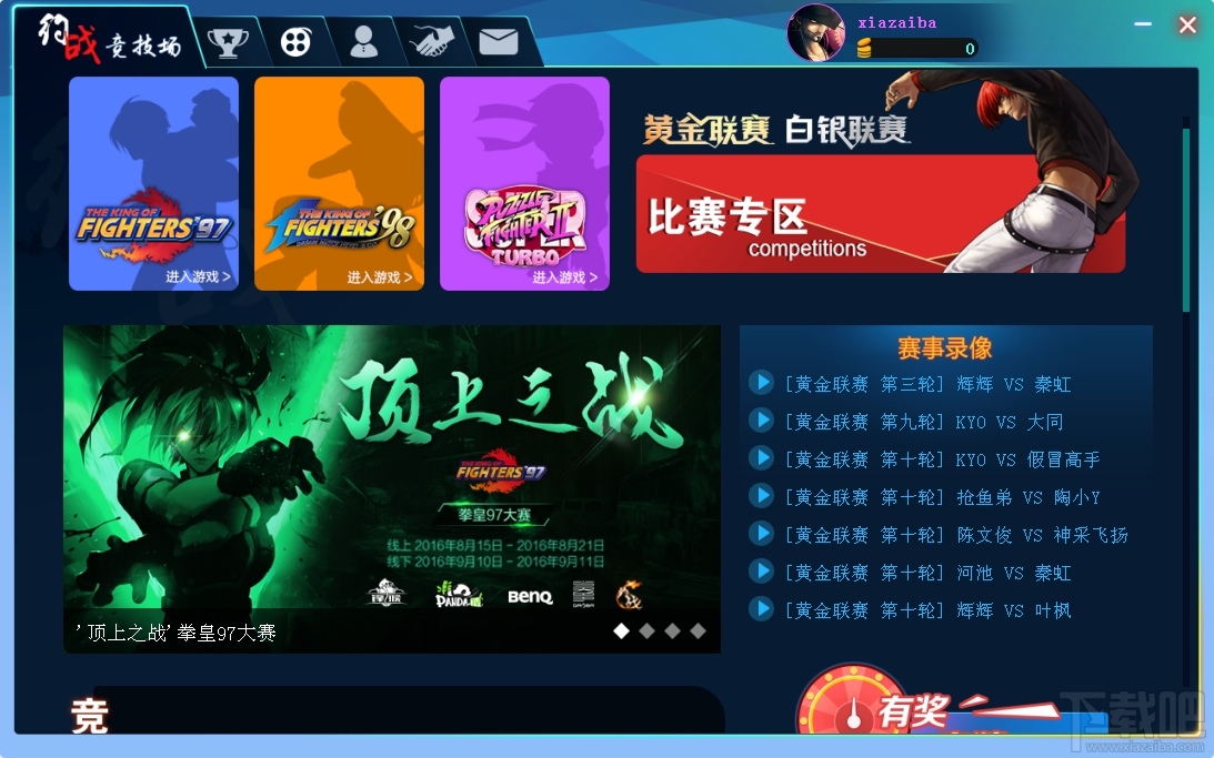 为了增加游戏的竞技性和趣味性,约战竞技场还专门邀请了国内一些知名格斗游戏高手入驻,举办为期三个月的《拳皇97》全国黄金联赛和白银联赛,邀请了十多位国内技术顶尖的玩家,以及熊猫、斗鱼等直播平台上人气最旺的《拳皇97》的游戏主播。快来挑战吧!与此同时,约战竞技场将陆续开展线上线下竞技挑战赛,并准备丰厚奖金和福利。