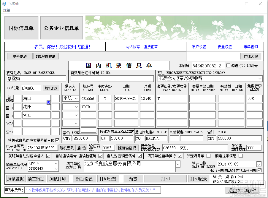 飞旅通机票打印软件是一款集机票行程单打印、国际行程单打印、机票信息告知单等功能于一体的为机票代理人服务的商旅软件,主要功能:PNR提取、票号提取、行程信息告知单打印。
