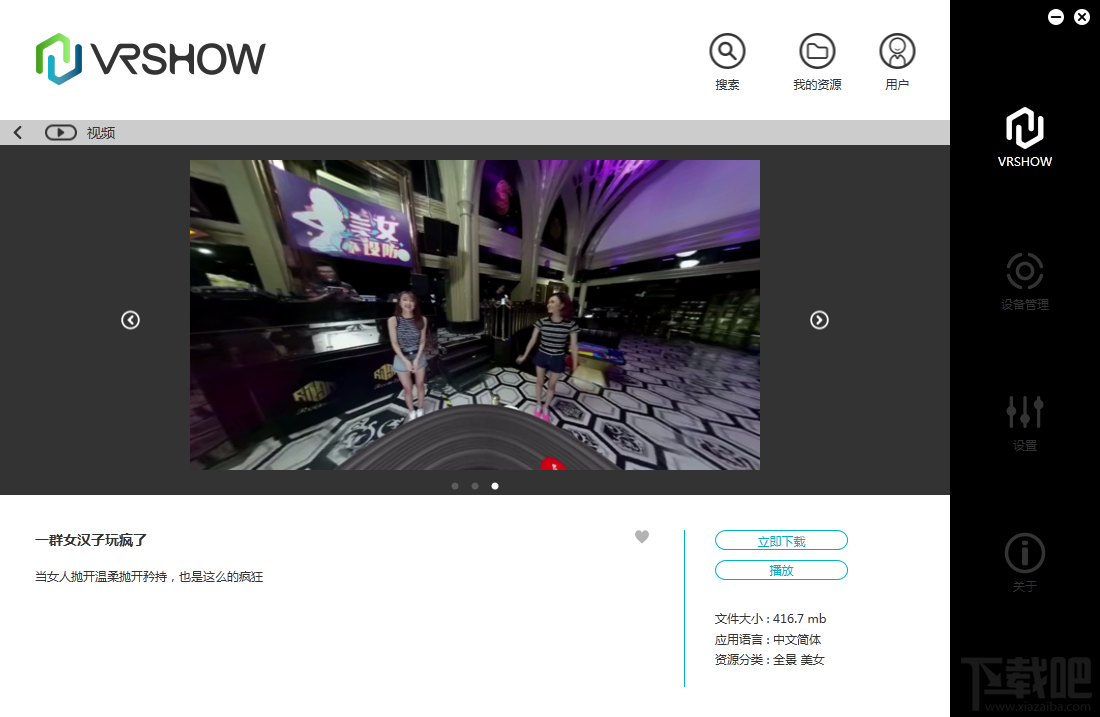 VRSHOW客户端是一款VR内容管理客户端工具。VRSHOW客户端提供VR内容、VR视频播放,VR用户通过VRSHOW客户端,可以直接下载在线资源或者管理本地资源。同时用户可以更新设备固件,优化设备,获得更佳的VR体验。VRSHOW让您随时随地进入VR虚拟世界,探索VR的乐趣。