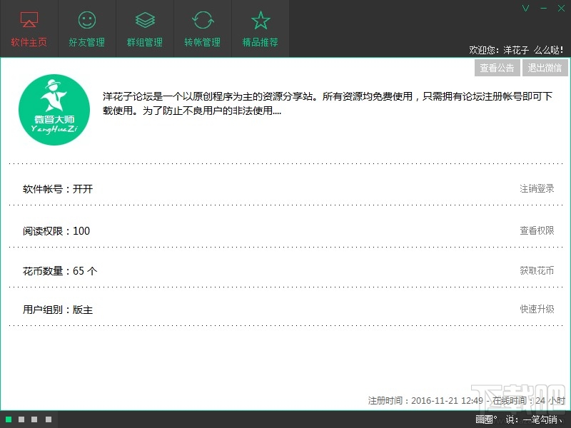 微管大师是一款基于微信消息收发的管理工具。软件可以帮助用户管理微信信息收发,具有群组管理、转账管理、好友管理等功能。微管大师根据用户设定的参数,快速响应,准确识别,全后台化自动操作,无需人工干涉,智能化处理各种交互数据,省时省力。