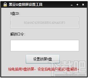 黑豆U盘锁屏设置工具是一款制作U盘锁屏的工具。打开hd开头的exe文件,按照提示插入U盘,请勿插入多个,软件读取U盘后会自动提示或者填入U盘数据,设置好后,需要锁屏请打开sp.exe文件,即可锁屏!