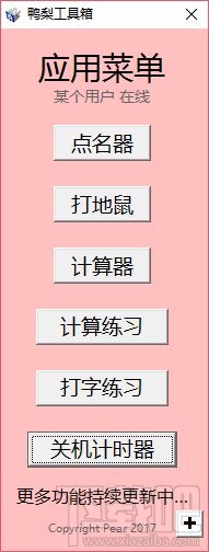 鸭梨工具箱是一款好玩工具软件。这可能是世界上最套路的一个程序。点名器?打地鼠?计算器?这可能是学校上课必备的助手。计算练习?打字练习?课间无聊的小帮手。关机计时器?还怕没人关电脑吗?它可以帮你实现!