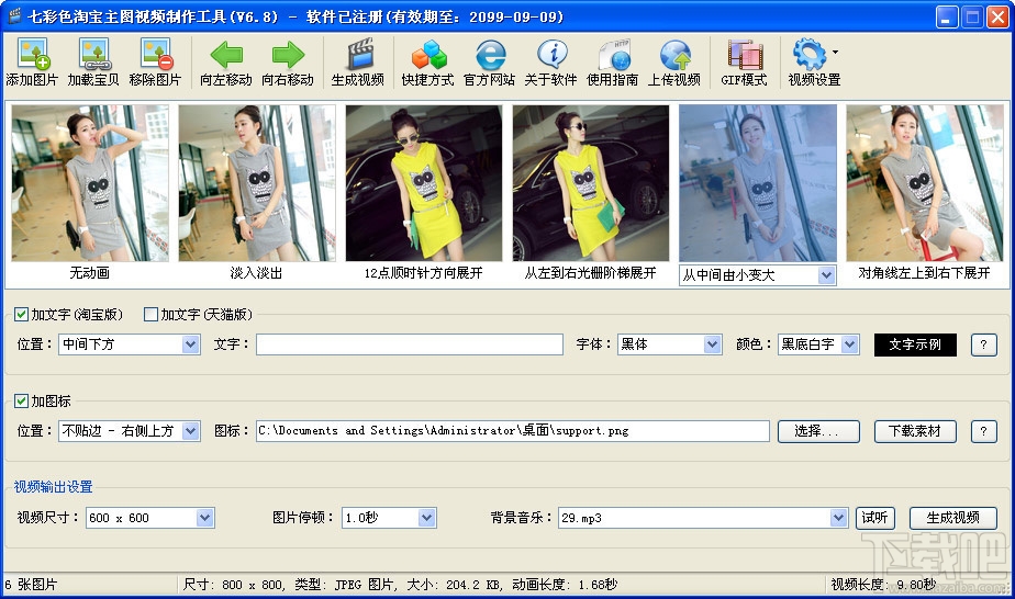 七彩色淘宝主图视频制作工具将多张宝贝图片合并成拥有多种动画展示效果的主图视频。支持处理的图片格式:JPG,PNG,BMP,静态GIF,TBI。