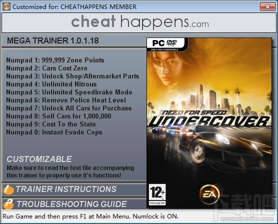 极品飞车12修改器升级版包含10项和8项属性修改器两款,先启动修改器再启动游戏,在主菜单按F1激活修改器,按下面热键修改:
