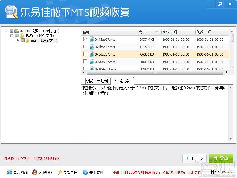 乐易佳松下MTS视频恢复软件是专业的松下MTS格式视频恢复软件。使用碎片重组技术,完美恢复松下相机卡上的MTS格式视频,恢复出来的文件可以正常播放和编辑。可以恢复误删除、误格式化、病毒破坏等各种原因导致的松下MTS视频文件丢失。支持松下EOS全系列单反相机、摄像机拍摄的MTS格式视频.