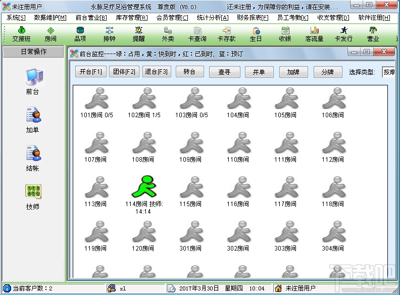 永脉X1足浴保健管理软件适用于适合足疗、房间(床位、桌台)管理的综合管理场所,如用手牌管理,请用洗浴软件。基本模块:系统管理、数据维护、前台营业、库存管理、会员管理、统计分析、财务报表。