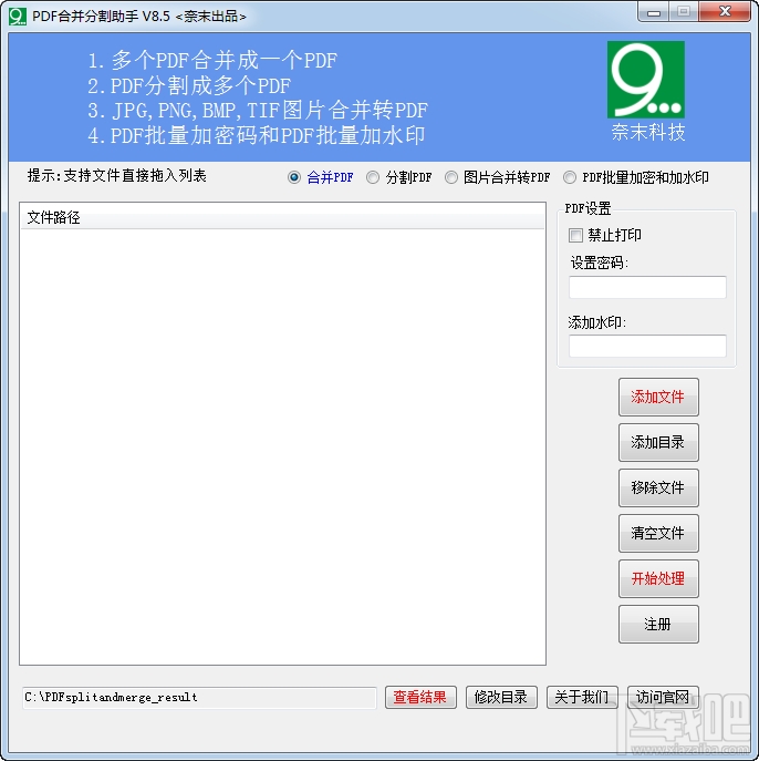 PDF合并分割助手是奈末科技专为批量处理PDF文件而设计的软件,软件操作简单,绿色软件,无需安装,解压后即可用。软件具有四大个功能: