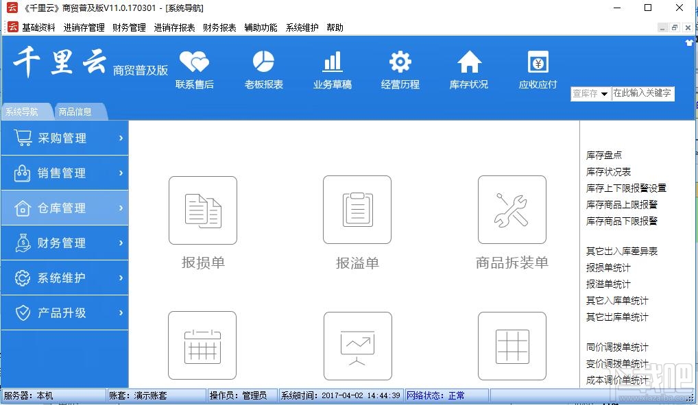 千里云进销存财务软件是一款集进货、销售、库存、财务为一体的全功能商贸管理软件。适用于中小企业及个体工商户的管理,主要功能包括:进货业务、进货退货业务、销售业务、销售退货业务、库存查询、库存调拨、报损报溢处理、商品拆装;往来单位应收应付查询、收款业务、付款业务、现金及银行管理、账务调整、费用处理;各类基础信息管理、各类报表统计;通过智能搜索工具快速查找相应信息。软件界面设计简洁,美观。其人性化的软件流程,不培训也能很快掌握软件使用的操作方法。
