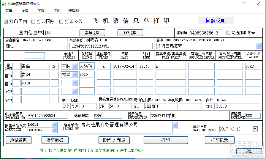 机票行程单打印软件是一款集机票打印、国际打印、公务打印、机票信息告知单等功能于一体的为机票代理人服务的商旅软件,主要功能:PNR提取、票号提取、execel导入打印、信息告知单打印。