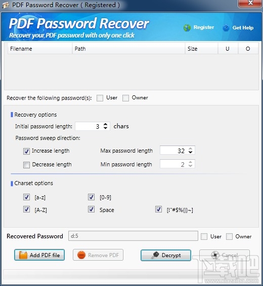 PDF Password Recover是非常强大的一套针对PDF文件的密码和谐,找回工具。当用户忘记或者不知道PDF文件的密码,包括打开密码与权限密码的时候,可以用该工具进行找回。只需要简单几步就可以找回PDF的密码。添加文件,设置密码恢复选项,密码长度,密码所包含的类型,开始解密,即可完成PDF文件的密码恢复与解密工作。