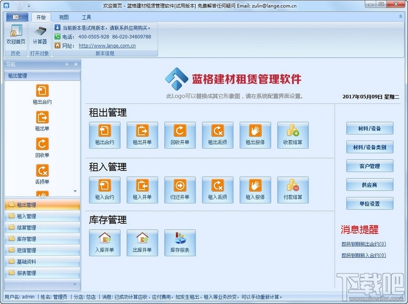 蓝格建材租赁管理软件是一款专门为建材行业提供租赁管理的软件,该软件界面简洁大方,为你提供强大实用的功能,包括租出管理、结算管理、库存管理、短信管理等,从而提高租赁管理的效率。