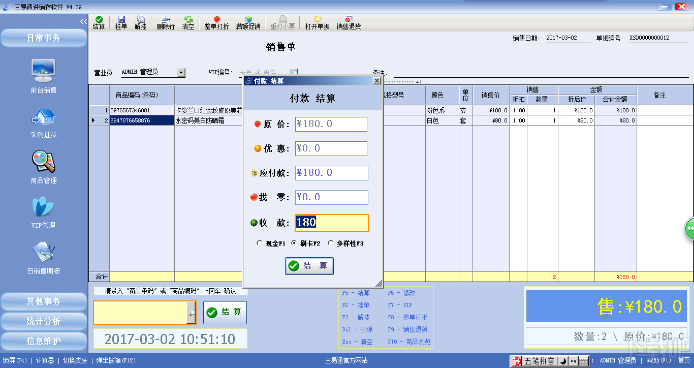 三易通销售管理软件系统、化妆品店管理软件、是专门针对专卖店收银软件,适合在化妆品、五金店、家纺、母婴用品、烟酒、皮具、服装等行业店铺销售领域的零售或批发使用,充分满足各行业收银管理软件个性化、特色化、简洁化、傻瓜化的特点。品牌专卖行业众多,特性各异,管理复杂,销售管理软件适合多行业、多品牌的混合管理,性能更完善,使您拥有IT贴心管家,总能让您从容应对挑战。业务功能流程化,导航式设计,一切从简单出发,店铺收银管理软件易学易用易维护,10年产品化设计开发经验,30,000用户的应用体验,系统更是固若金汤、稳如泰山。