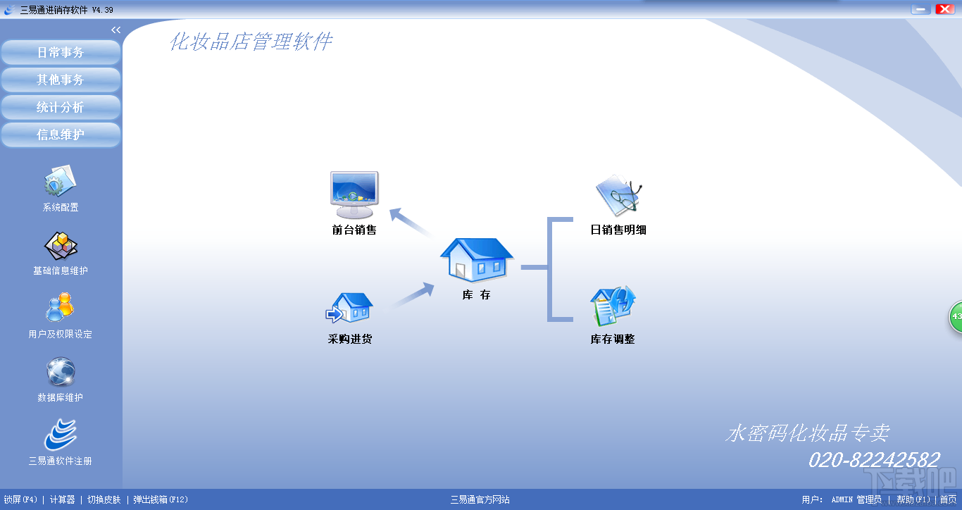 三易通化妆品店管理软件系统、化妆品连锁管理软件、是专门针对化妆品专卖店收银软件,适合在化妆品行业店铺销售领域的零售或批发使用,充分满足化妆品行业收银管理软件个性化、特色化、简洁化、傻瓜化的特点。三易通化妆品店管理软件系统为广州河东软件科技有限公司研发的易学易用易管理的化妆品管理软件,软件以以图形化的导航式界面,快速完成日常销售、会员管理、采购进货、库存管理、并结合完善的统计报表,使企业决策者最关心的进销存分析、利润分析、销售状况、库存数量等能够即点即现。各单据、报表可以方便进行打印。