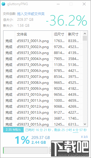 gluttonyPNG不仅可以显示压缩的进度百分比,还可以实时显示压缩速度(M/s)、预计剩余时间、当前线程数、实时体积减少比例,如同下载工具一般,能够方便的了解压缩任务的进展。