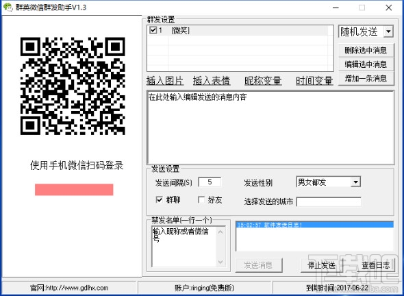群英微信群发软件自动发微信好友和群,发消息开头支持加入微信名称,支持微信扫码登录,无需登录PC版微信,可添加禁发名单和指定好友或群发送,支持筛选性别发送,软件不限制电脑使用。