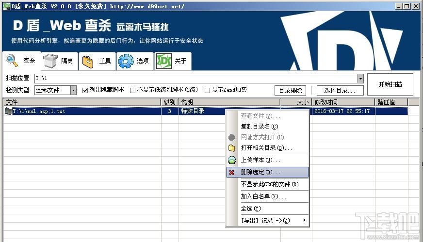 D盾Web查杀是由“迪元素科技有限公司”研制。自主研发不分扩展名的代码行为分析引擎(非简单的字符串查找引擎),能识别更多的后门行为。D盾Web查杀软件使用自行研发不分扩展名的代码分析引擎,能分析更为隐藏的WebShell后门行为。引擎特别针对,一句话后门,变量函数后门,${}执行,执行,preg_replace执行、call_user_func、file_put_contents、fputs等特殊函数的参数进行针对性的识别,能查杀更为隐藏的后门,并把可疑的参数信息展现在你面前,让你能更快速的了解后门的情况新版特别针对 dedecms的{dede:php}{/dede:php}代码加入了识别!