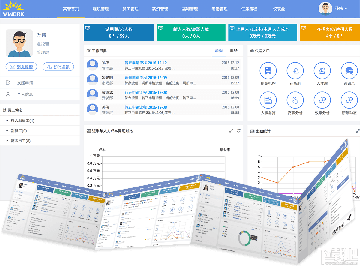 数据分析:顶尖的数据建模分析能力,系统自动进行人力布局、人力动态、人力成本等分析,为企业提供切实有效的决策支持。