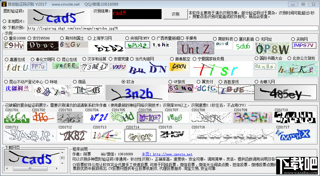CV全自动图形图片验证码识别软件是一款能够识别验证码图片的软件。识别程序以dll的方式提供使用,通过简单的函数调用即可识别复杂的验证码图片。软件识别率达80%-100%(指不太复杂的验证码),正确率高,本地图片识别速度一般0.1秒以内,安全可靠。