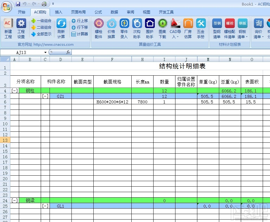 AC钢构预算软件是基于Microsoft Excel 的插件,软件各项功能更是我们多年钢结构预结算经验的总结。支持Excel2007-2016完整版,WPS2016专业增强版。本软件主要功能有:自动呈现重量和表面积计算过程、内置1000多种常见型钢理重、其中热轧H型钢支持98/05/10三种版本、各种钢结构算量工具箱、单价换算工具、厂房估算程序等,一键输出采购清单、钢板用料分析、报价单、13清单、钢结构生产型企业需要的材料报价单等。