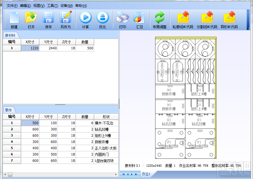 极限切割雕刻机板材切割软件是一款雕刻机板材切割优化软件。输入原材料尺寸;矩形零件输入尺寸/异型零件选择图形;计算(一个完美的切割方案呈现在您的面前)。