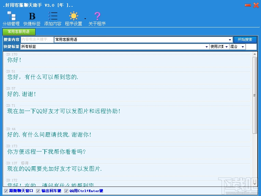 好用客服聊天助手是专门的客服聊天助手,能够帮助如QQ,TM,旺旺,淘宝等客服人员快捷回复客户咨询,让客服人员从大量的打字工作量解脱出来。可以同时发送文字内容,图片信息等。是客服人员最得力的助手。
