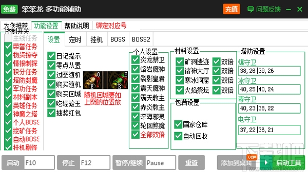 2、一键设置:荣誉任务、物资掠夺、情报刺探、积分任务、塔防封魔、军功任务、材料副本、英雄任务、神魔之塔、个人BOSS、挖矿任务、自动BOSS、挂机刷怪;