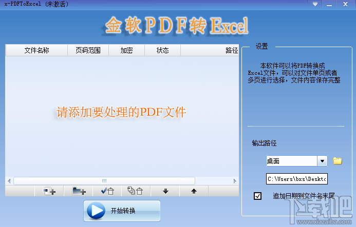 x-PDFToExcel工具是一款PDF转Excel工具。x-PDFToExcel可以批处理同时为多个文件进行处理。金软PDF转Excel可以对需要转换的文档进行指定页面范围设置,以满足用户的需求;可以对加密的文件进行解密,了解其文档的文书情报等功能,金软PDF转Excel是一款无需Adobe Acrobat 等软件的支持,就可以将多个PDF文件转换成Excel的软件,其操作方便、简单。