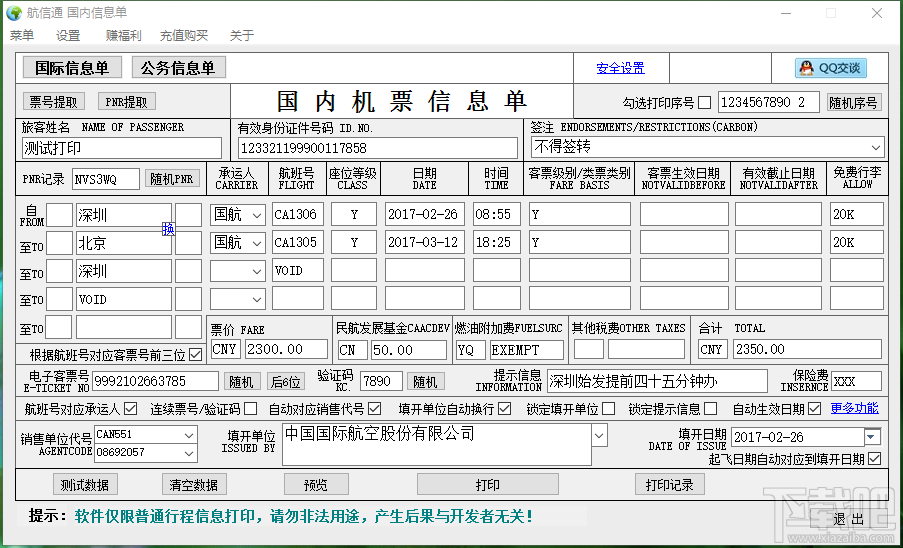 航信通机票打印软件是一款集机票行程单打印、国际行程单打印、机票信息告知单等功能于一体的为机票代理人服务的商旅软件,主要功能:PNR提取、票号提取、行程信息告知单打印。